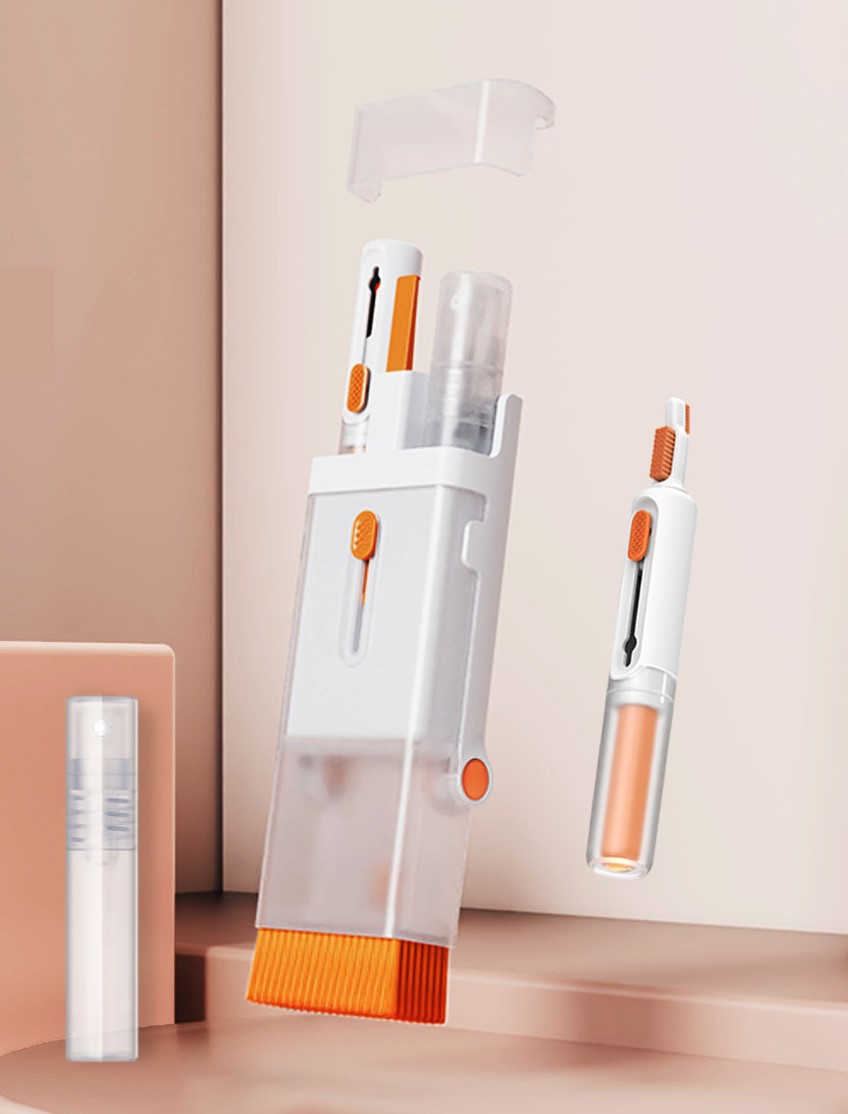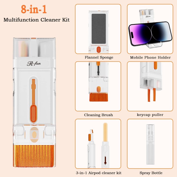 8-in-1 Multifunction Kit: Includes a phone holder, brushes, sponge, keyboard tools, and a 5ml screen cleaner spray for comprehensive device cleaning.
