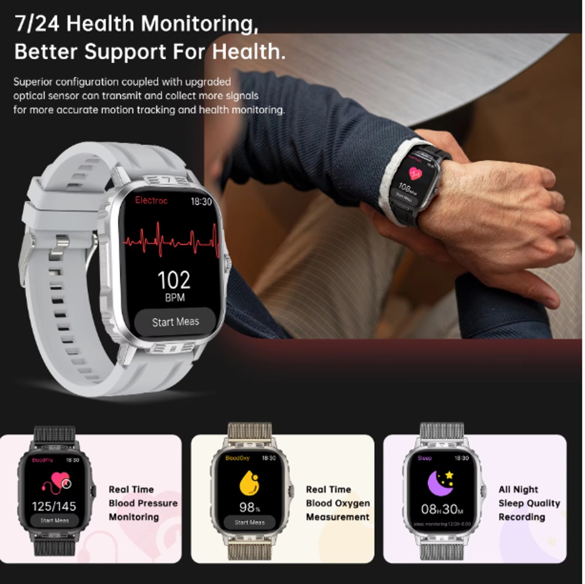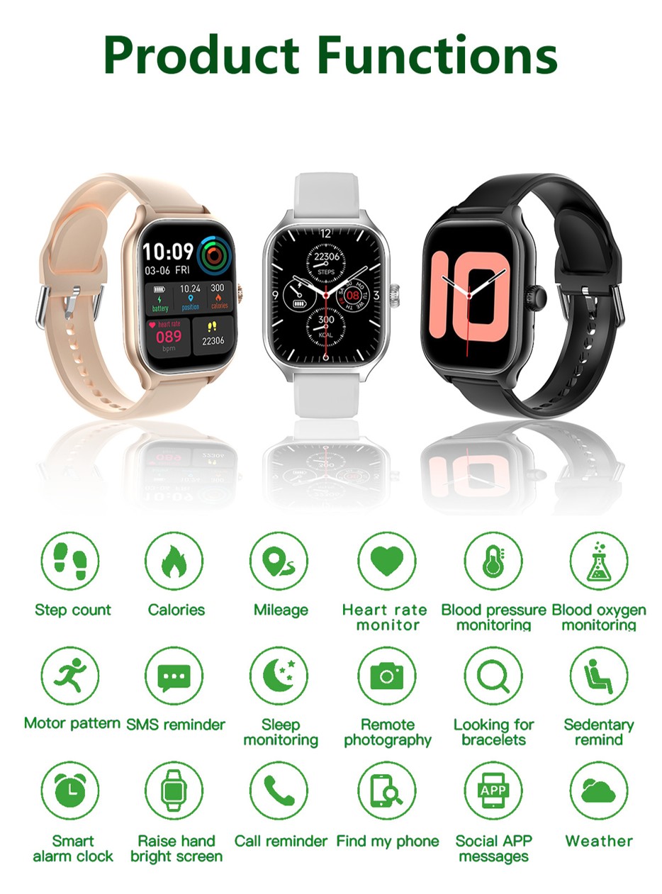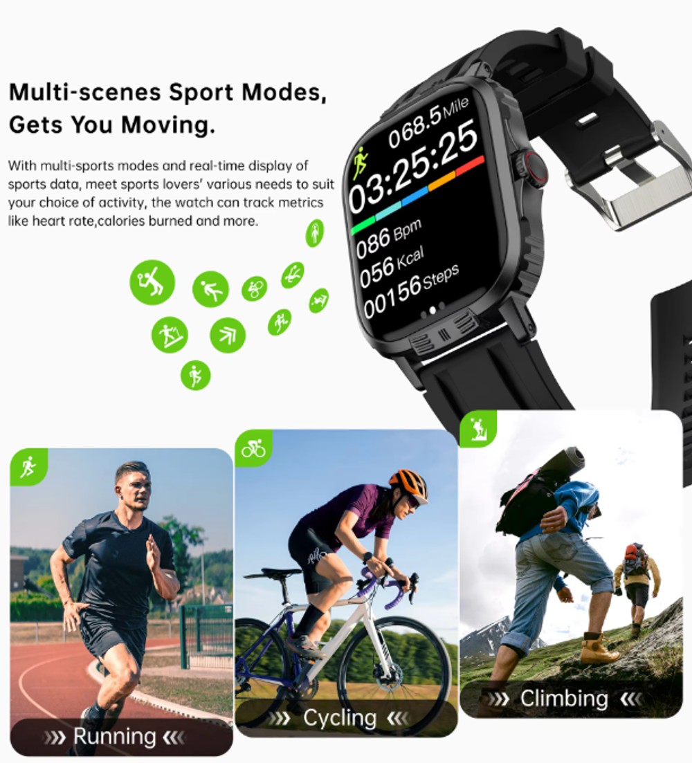 - Health Monitoring: Tracks heart rate, blood pressure, and blood oxygen levels in real-time, ensuring better health awareness and fitness tracking.