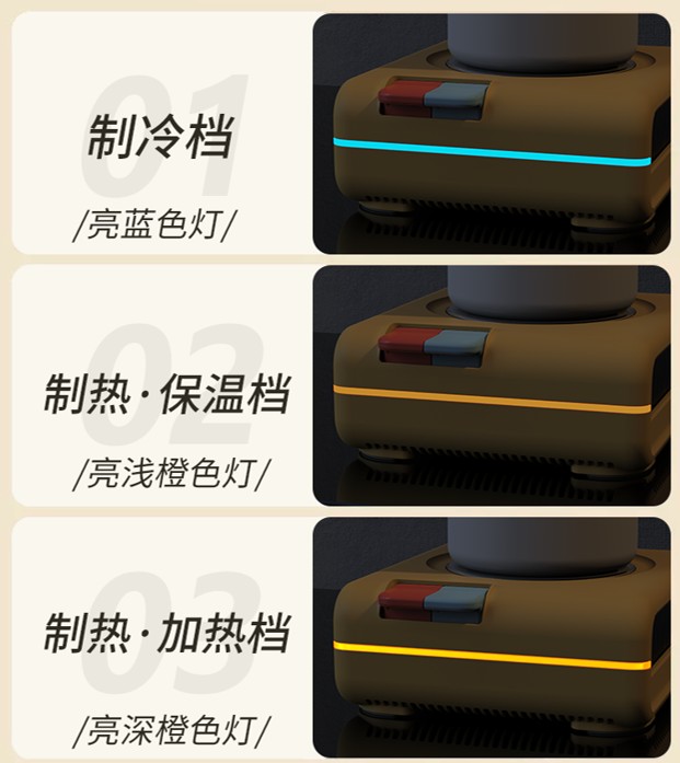 Warming Mode: Light orange indicator — maintains 45–55 °C for drinks ☕