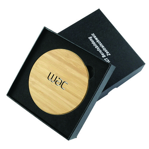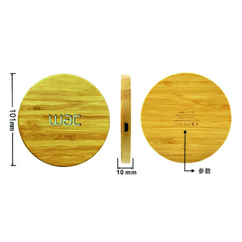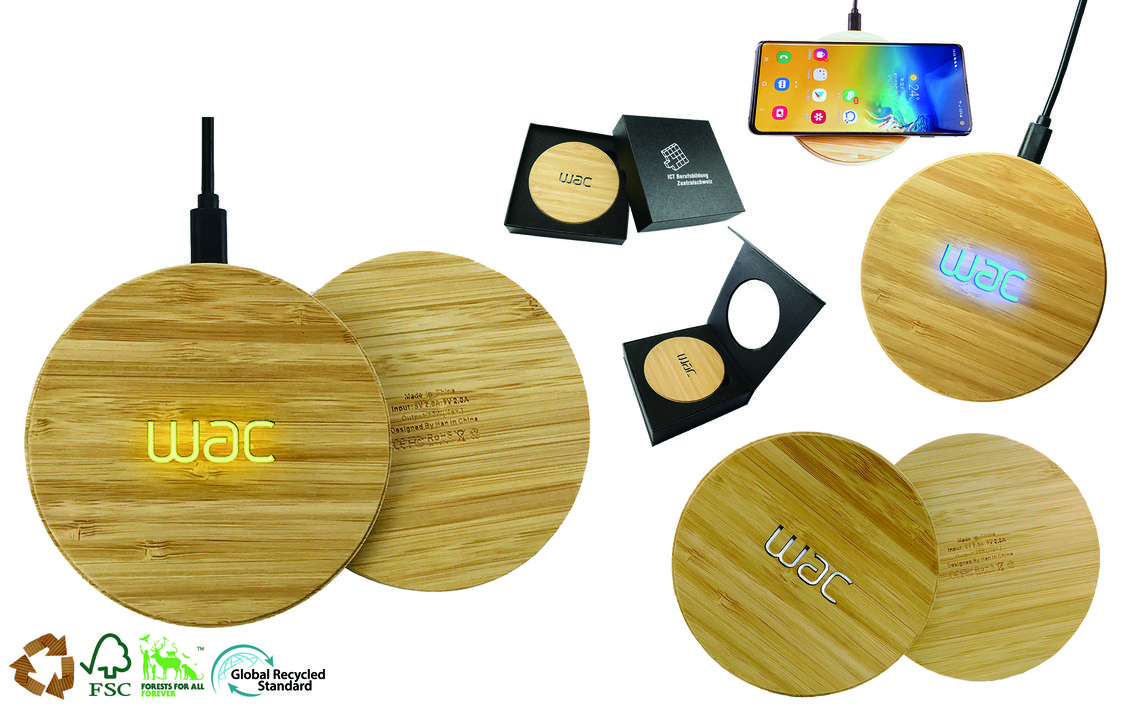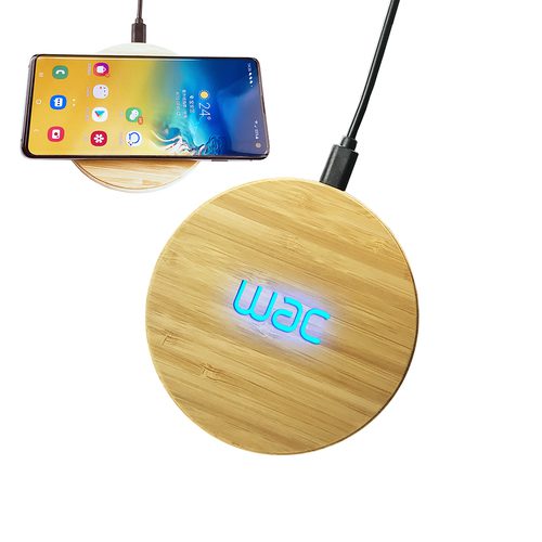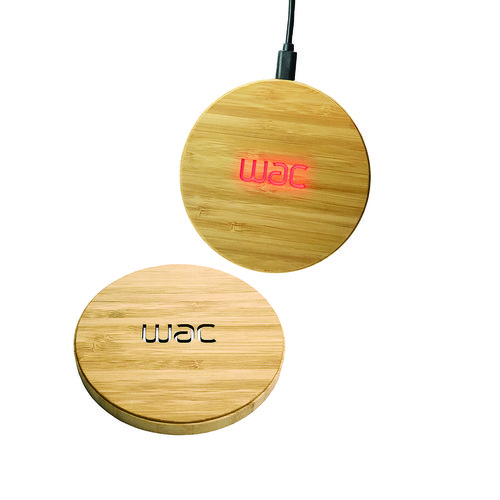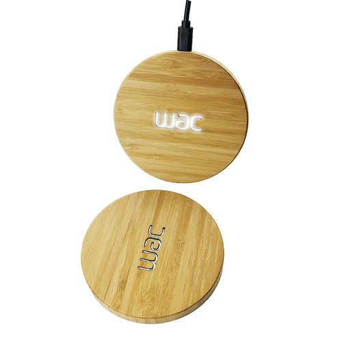 Premium, lightweight, fast charging, eco-friendly bamboo charger pad that allows you to carve your logo or message and charge wirelessly while it lights up, making it very premium and noticeable!