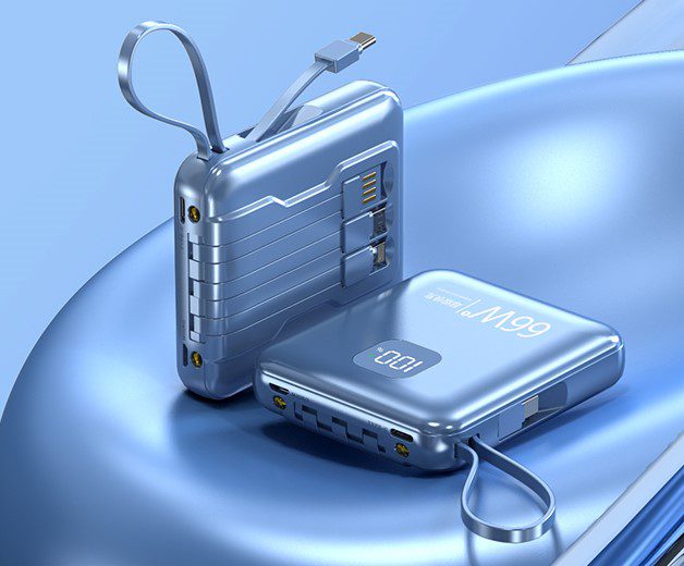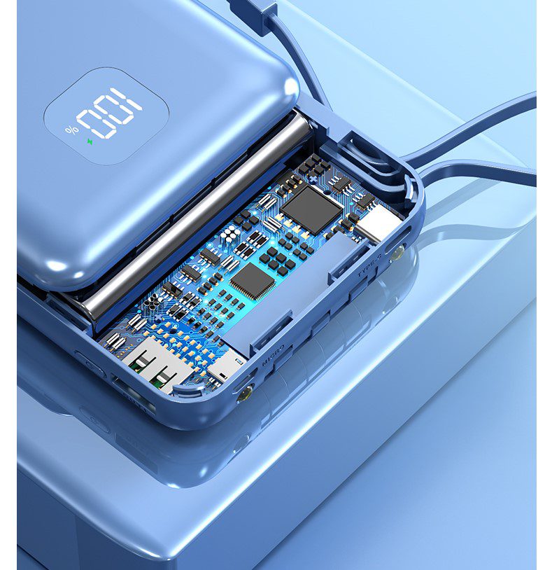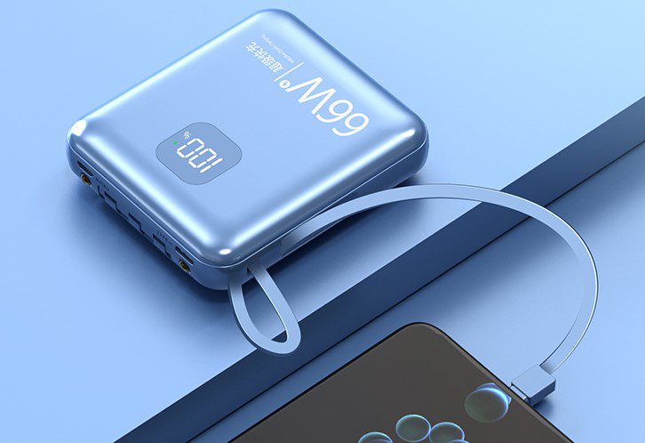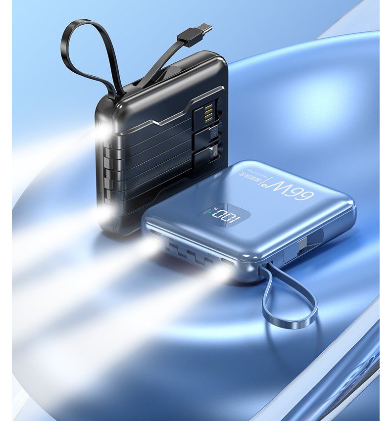 • This 66W fast charging mini powerbank comes with a flashlight function, a digital power display that shows how much battery is left & has multiple built-in cables which can charge various devices.