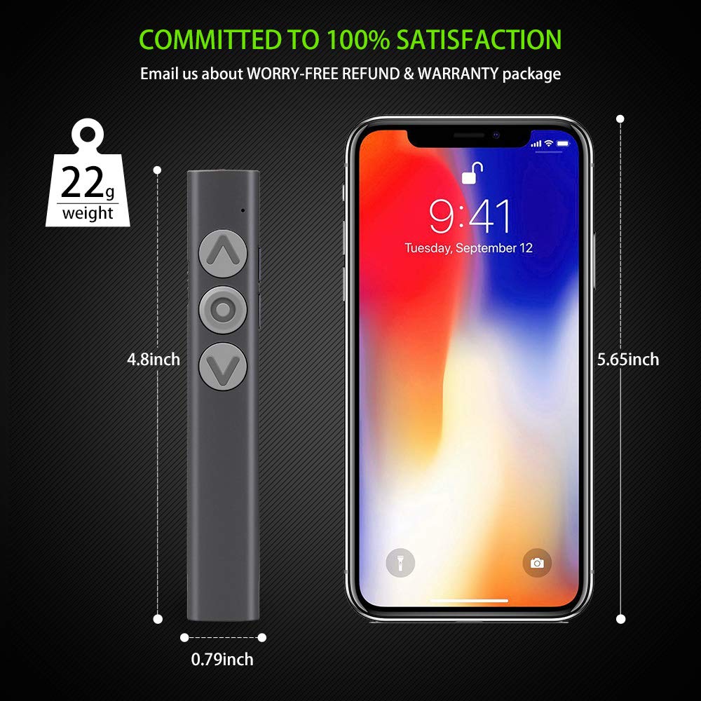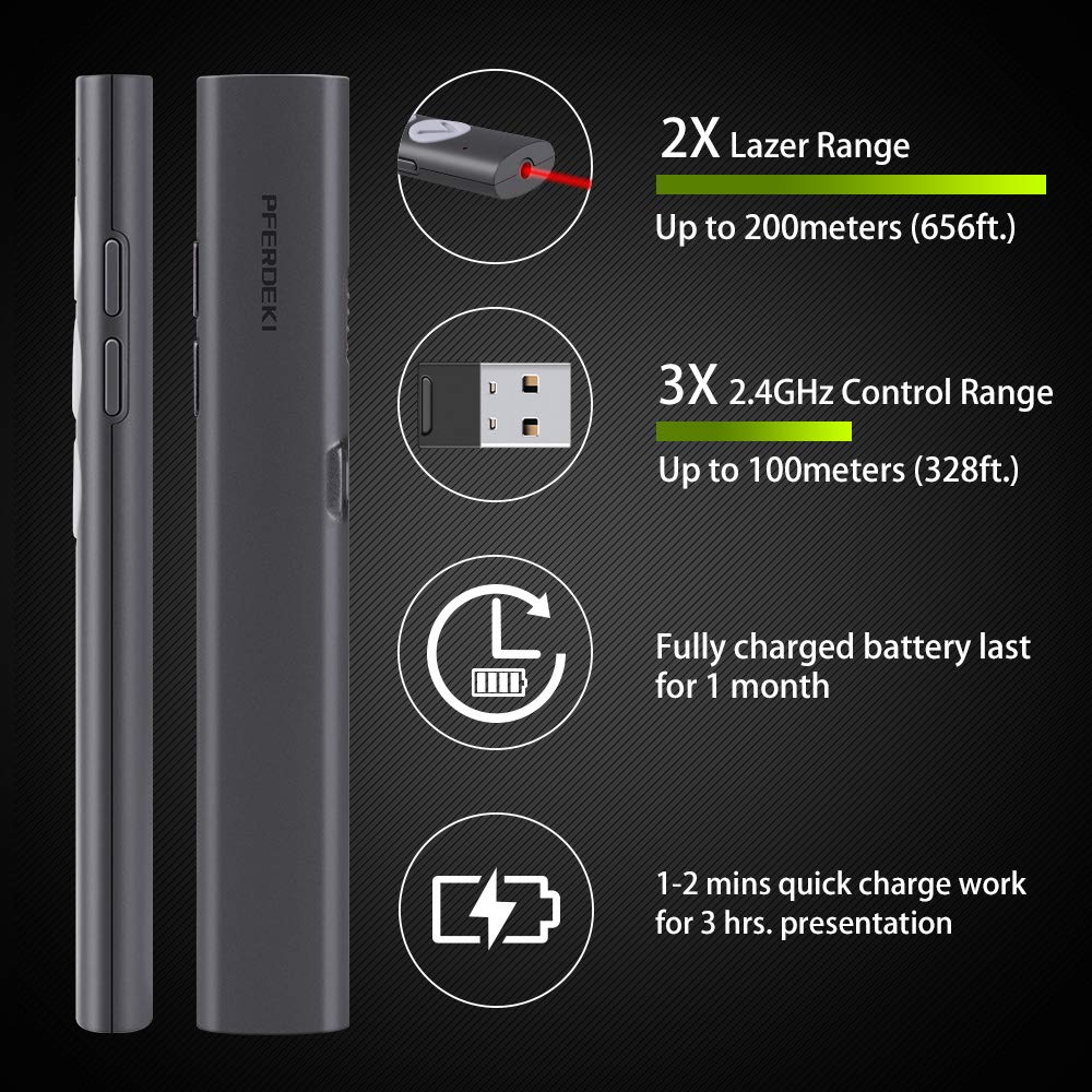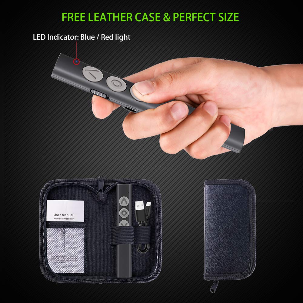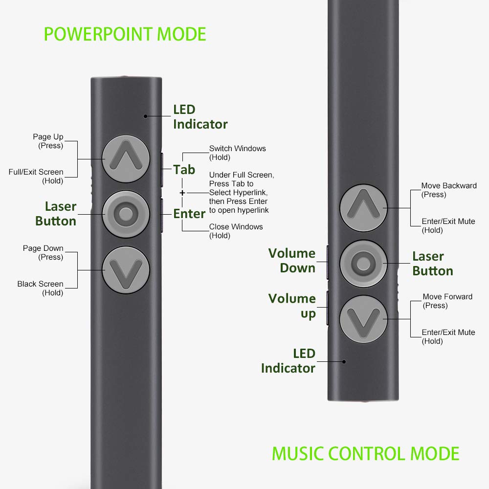 • All – New Dual Modes: Press and hold the “page up” and “tab” buttons until the LED lights on to switch between power point mode and music control mode.