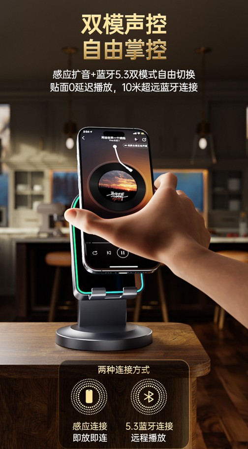 ⚡ Dual Connection Modes: Switch freely between Bluetooth 5.3 and Induction Mode — play music instantly when your phone touches the base.