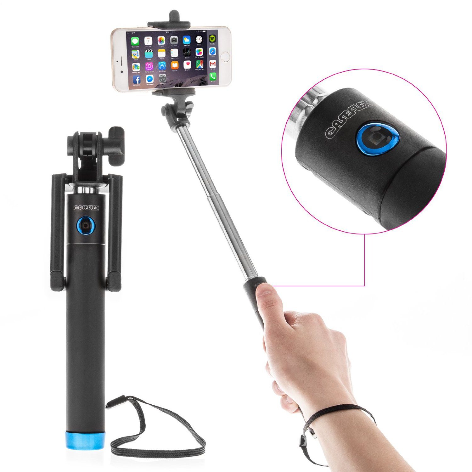 • SynopsisLuxuriousand premium-looking selfie stick with a retractable holder to secure your phone and a 3.5mm jack that can be plugged into your phone for the camera control button on the selfie stick itself.