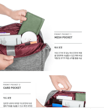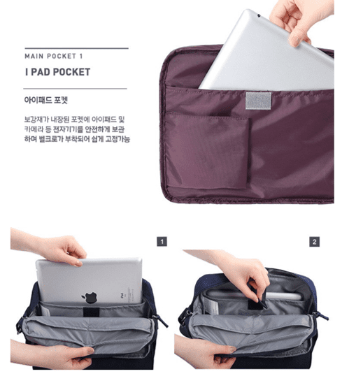 • This bag consists ofIpad/tablet compartment, water bottle compartment,creditcard/ID compartment, mesh compartment forsupplements/medication, compartment for magazines/ documents.