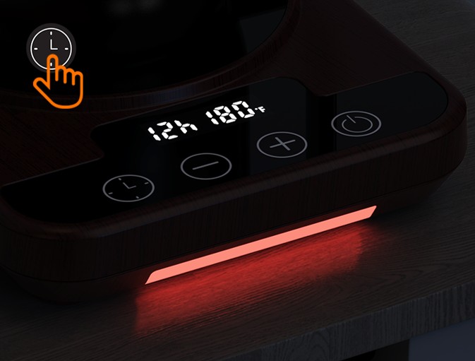 Touch buttons for power, 9-step temperature, and 1–12 hour timer.