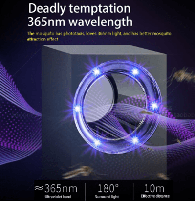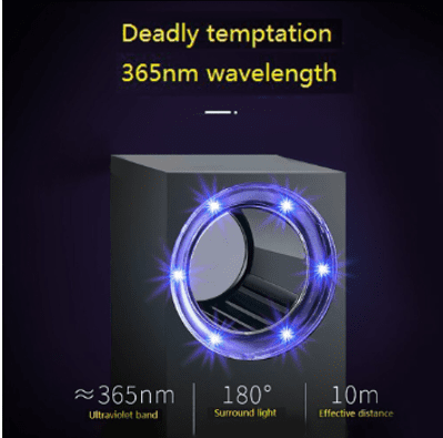 • UV light emitted by LED Bait illuminated by mosquitoes and flies near the trap lamp. As soon as they fly past the capture window, a built-in DC fan will suck them into the storage box. Then the mosquitoes will get trap inside before they die.